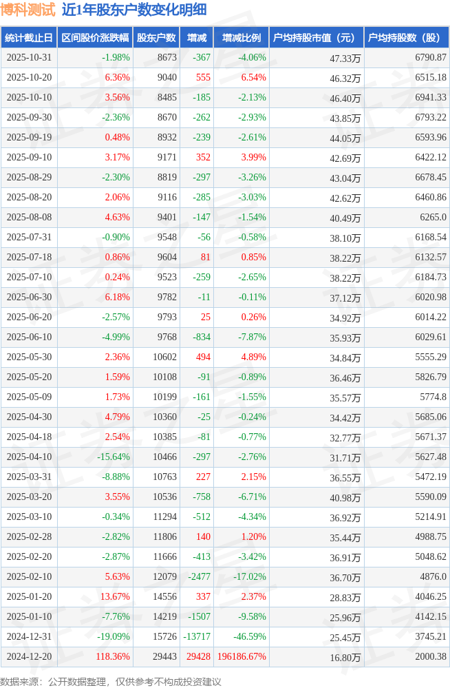 从股价来看,2025年10月20日至2025年10月31日,博科测试区间跌幅为1.98%,在此期间股东户数减少367.0户,减幅为4.06%。