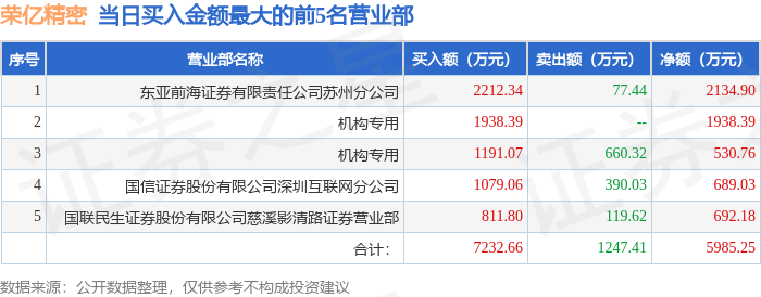 证券之星消息,沪深交易所2025年11月4日公布的交易公开信息显示,荣亿精密(920223)因当日换手率达到20%的前5只股票登上龙虎榜。此次是近5个交易日内第1次上榜。