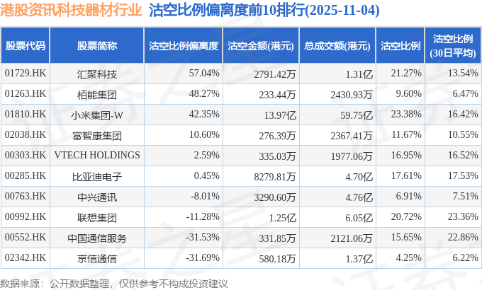 从沽空比例偏离度来看,汇聚科技、栢能集团、小米集团-W沽空比例偏离度位居行业前三,分别为57.04%、48.27%、42.35%。