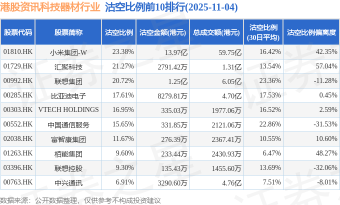 从沽空比例来看,小米集团-W、汇聚科技、联想集团沽空比例位居行业前三,分别为23.38%、21.27%、20.72%。