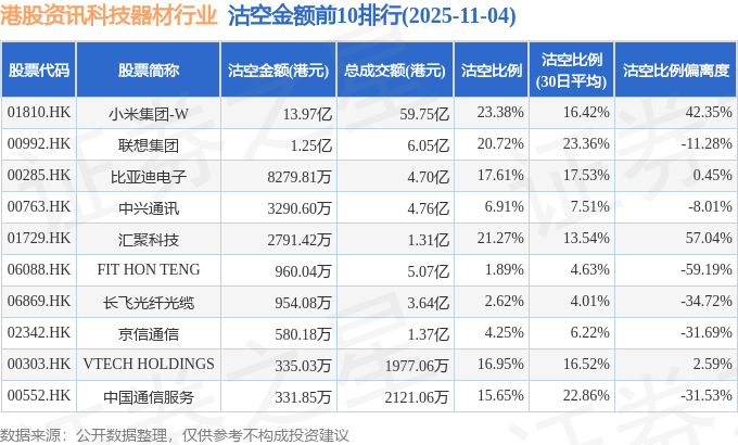 从沽空金额来看,小米集团-W、联想集团、比亚迪电子沽空金额位居行业前三,分别为13.97亿港元、1.25亿港元、8279.81万港元。