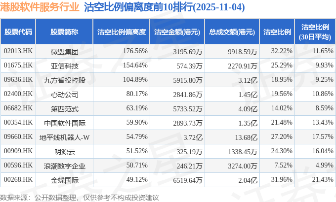 从沽空比例偏离度来看,微盟集团、亚信科技、九方智投控股沽空比例偏离度位居行业前三,分别为176.56%、154.64%、104.89%。