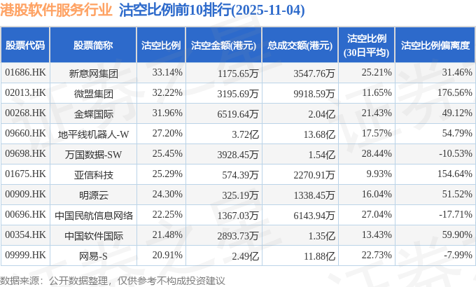 从沽空比例来看,新意网集团、微盟集团、金蝶国际沽空比例位居行业前三,分别为33.14%、32.22%、31.96%。