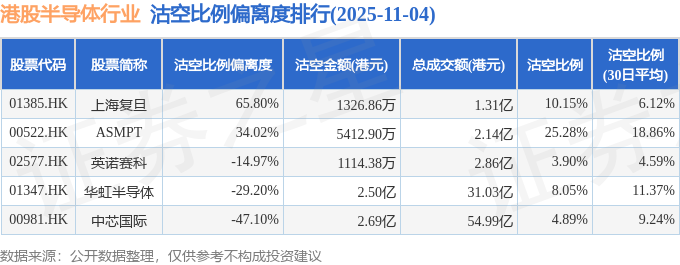 从沽空比例偏离度来看,上海复旦、ASMPT、英诺赛科沽空比例偏离度位居行业前三,分别为65.8%、34.02%、-14.97%。