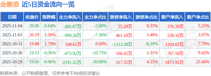 证券之星消息,截至2025年11月4日收盘,金徽酒(603919)报收于20.06元,下跌0.64%,换手率0.71%,成交量3.59万手,成交额7172.13万元。