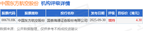 截至2025年11月4日收盘,中国东方航空股份(00670.HK)报收于4.16港元,上涨0.24%,成交量1742.47万股,成交额7284.74万港元。投行对该股的评级以增持为主,近90天内共有1家投行给出增持评级,近90天的目标均价为4.3港元。国泰海通证券股份有限公司最新一份研报给予中国东方航空股份增持评级,目标价4.3港元。