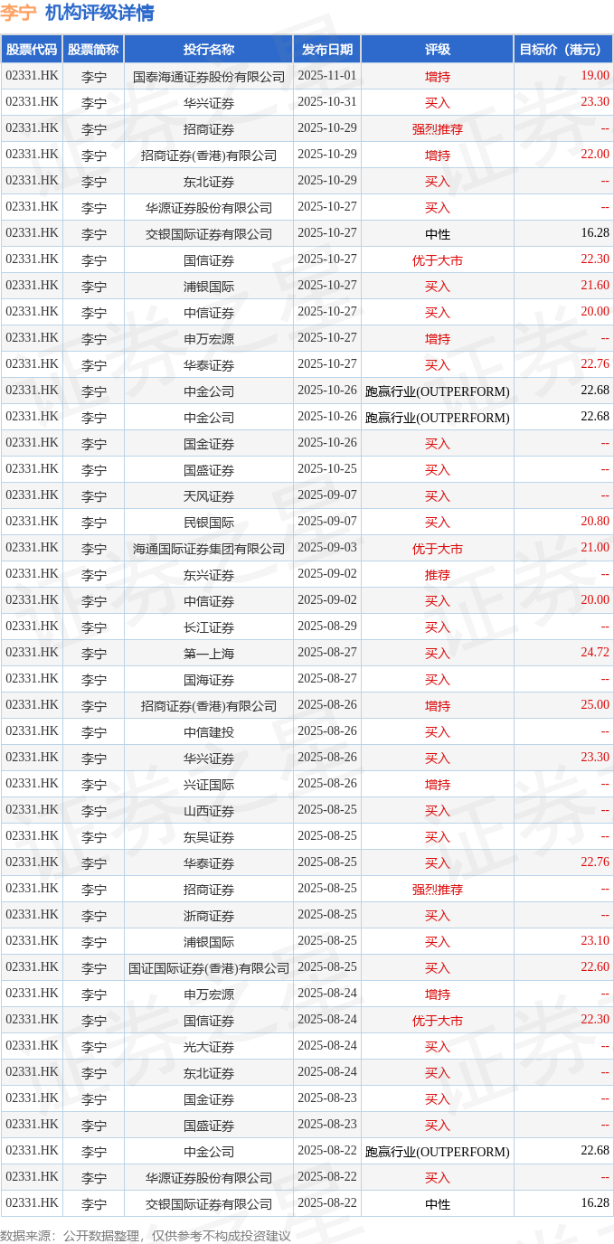 截至2025年11月4日收盘,李宁(02331.HK)报收于16.64港元,下跌1.83%,成交量1642.35万股,成交额2.74亿港元。投行对该股的评级以买入为主,近90天内共有27家投行给出买入评级,近90天的目标均价为21.69港元。国泰海通证券股份有限公司最新一份研报给予李宁增持评级,目标价19港元。
