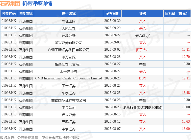 截至2025年11月4日收盘,石药集团(01093.HK)报收于7.35港元,下跌4.42%,成交量1.44亿股,成交额10.73亿港元。投行对该股的评级以买入为主,近90天内共有10家投行给出买入评级,近90天的目标均价为13.4港元。兴证国际最新一份研报给予石药集团买入评级。