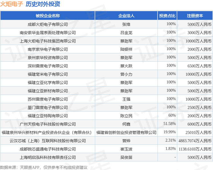 证券之星消息,根据天眼查APP显示,火炬电子(603678.SH)新增一起对外投资事件,被投资公司为上海明启泓科科技有限责任公司,法定代表人吴俊苗,投资占比为-。该公司从事软件和信息技术服务业,注册资本为5000万人民币。目前,火炬电子共存在对外投资17项,详见下表: