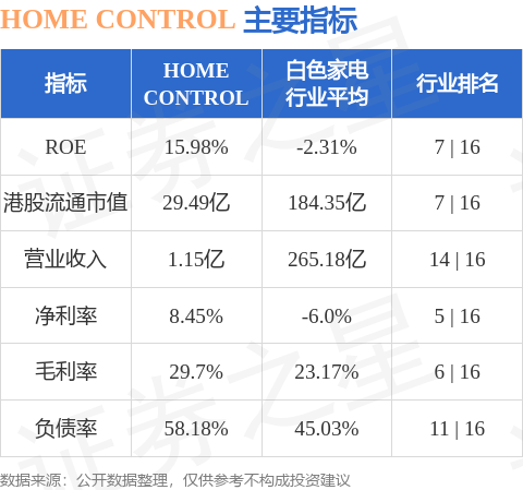 HOME CONTROL港股市值29.49亿港元,在白色家电行业中排名第7。主要指标见下表: