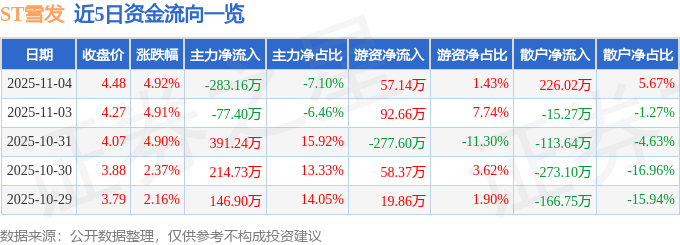 11月4日的资金流向数据方面,主力资金净流出283.16万元,占总成交额7.1%,游资资金净流入57.14万元,占总成交额1.43%,散户资金净流入226.02万元,占总成交额5.67%。