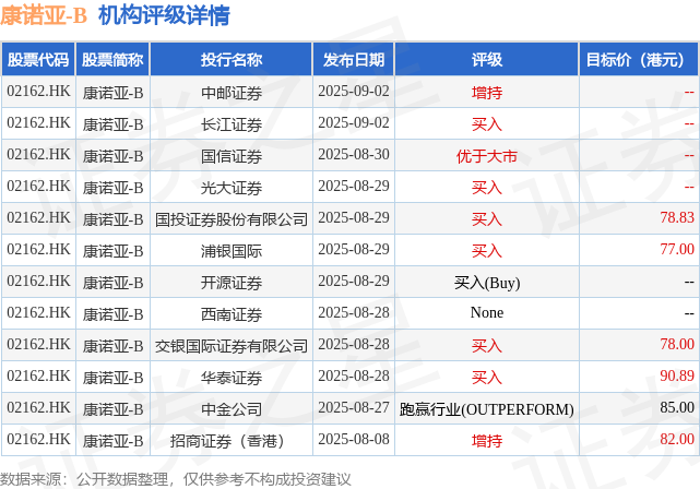 投行对该股的评级以买入为主,近90天内共有6家投行给出买入评级,近90天的目标均价为81.95港元。中邮证券最新一份研报给予康诺亚-B增持评级。