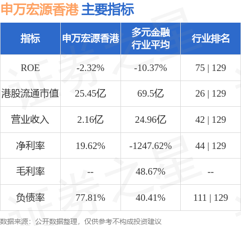 申万宏源香港港股市值25.45亿港元,在多元金融行业中排名第26。主要指标见下表: