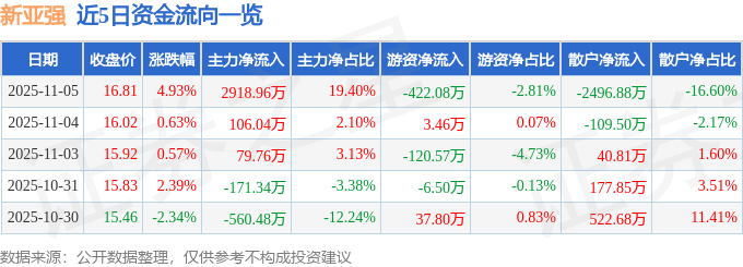 11月5日的资金流向数据方面,主力资金净流入2918.96万元,占总成交额19.4%,游资资金净流出422.08万元,占总成交额2.81%,散户资金净流出2496.88万元,占总成交额16.6%。