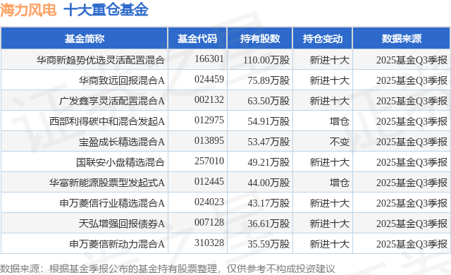 重仓海力风电的前十大公募基金请见下表: