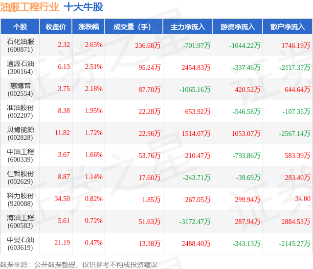 个股表现方面,油服工程行业当日领涨股为石化油服(600871),该股当日报收2.32,上涨2.65%,成交量236.68万,主力资金净流出701.97万元。通源石油(300164)以上涨2.51%紧随其后,该股当日成交量95.24万,主力资金净流入2454.83万元。除此之外,惠博普(002554)、准油股份(002207)、贝肯能源(002828)均进入当日牛股之列。具体个股列表见下表: