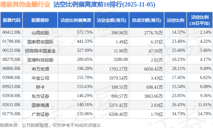 从沽空比例偏离度来看,山高控股、国泰君安国际、招商局中国基金沽空比例偏离度位居行业前三,分别为572.75%、441.33%、327.99%。
