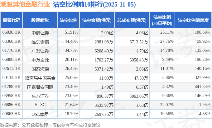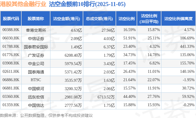 从沽空金额来看,香港交易所、中信证券、国泰君安国际沽空金额位居行业前三,分别为4.63亿港元、2.09亿港元、1.49亿港元。