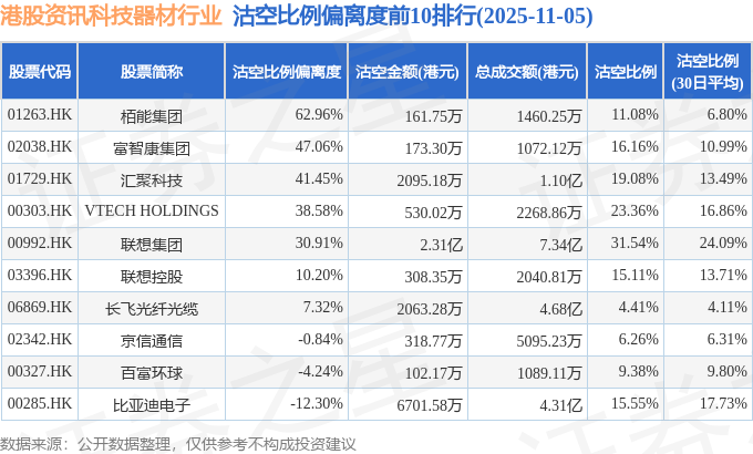 从沽空比例偏离度来看,栢能集团、富智康集团、汇聚科技沽空比例偏离度位居行业前三,分别为62.96%、47.06%、41.45%。