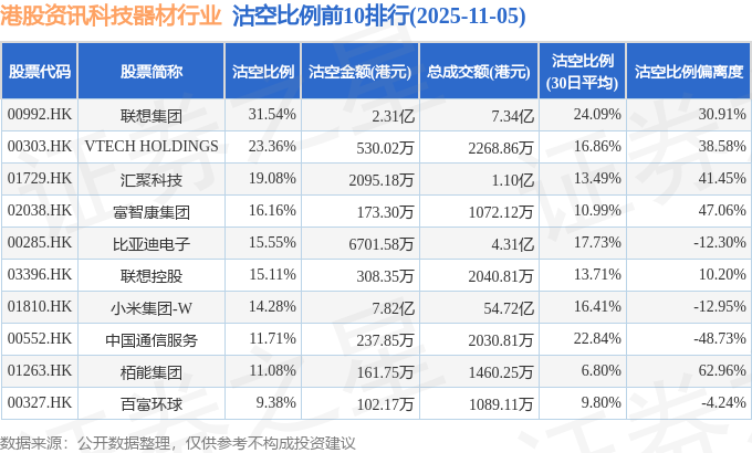 从沽空比例来看,联想集团、VTECH HOLDINGS、汇聚科技沽空比例位居行业前三,分别为31.54%、23.36%、19.08%。