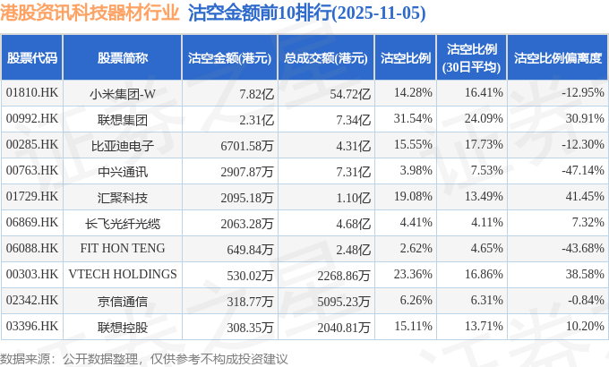 从沽空金额来看,小米集团-W、联想集团、比亚迪电子沽空金额位居行业前三,分别为7.82亿港元、2.31亿港元、6701.58万港元。