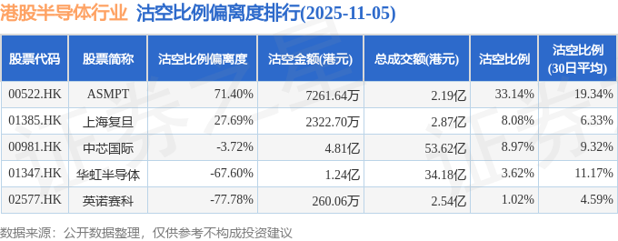 从沽空比例偏离度来看,ASMPT、上海复旦、中芯国际沽空比例偏离度位居行业前三,分别为71.4%、27.69%、-3.72%。