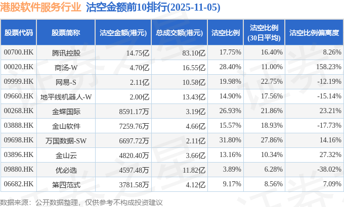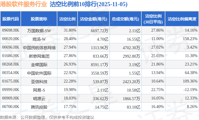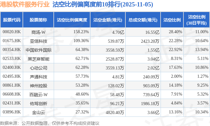 从沽空比例偏离度来看,商汤-W、亚信科技、中国软件国际沽空比例偏离度位居行业前三,分别为158.23%、109.36%、64.38%。