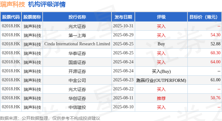 截至2025年11月5日收盘,瑞声科技(02018.HK)报收于38.38港元,下跌1.34%,成交量658.98万股,成交额2.52亿港元。投行对该股的评级以买入为主,近90天内共有6家投行给出买入评级,近90天的目标均价为57.21港元。光大证券最新一份研报给予瑞声科技买入评级。