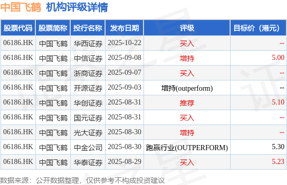 截至2025年11月5日收盘,中国飞鹤(06186.HK)报收于4.25港元,上涨0.95%,成交量2354.31万股,成交额9930.27万港元。投行对该股的评级以买入为主,近90天内共有4家投行给出买入评级,近90天的目标均价为5.16港元。华西证券最新一份研报给予中国飞鹤买入评级。