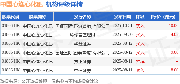 截至2025年11月5日收盘,中国心连心化肥(01866.HK)报收于7.34港元,上涨1.8%,成交量172.8万股,成交额1252.19万港元。投行对该股的评级以买入为主,近90天内共有5家投行给出买入评级,近90天的目标均价为10.26港元。国证国际证券(香港)有限公司最新一份研报给予中国心连心化肥买入评级,目标价10港元。