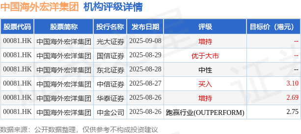 截至2025年11月5日收盘,中国海外宏洋集团(00081.HK)报收于2.24港元,上涨1.36%,成交量468.7万股,成交额1032.89万港元。投行对该股的评级以增持为主,近90天内共有2家投行给出增持评级,近90天的目标均价为2.85港元。光大证券最新一份研报给予中国海外宏洋集团增持评级。