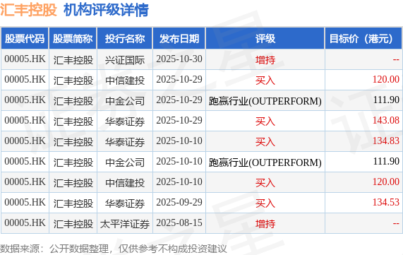 截至2025年11月5日收盘,汇丰控股(00005.HK)报收于108.2港元,上涨0.19%,成交量1020.06万股,成交额10.98亿港元。投行对该股的评级以买入为主,近90天内共有5家投行给出买入评级,近90天的目标均价为125.18港元。兴证国际最新一份研报给予汇丰控股增持评级。
