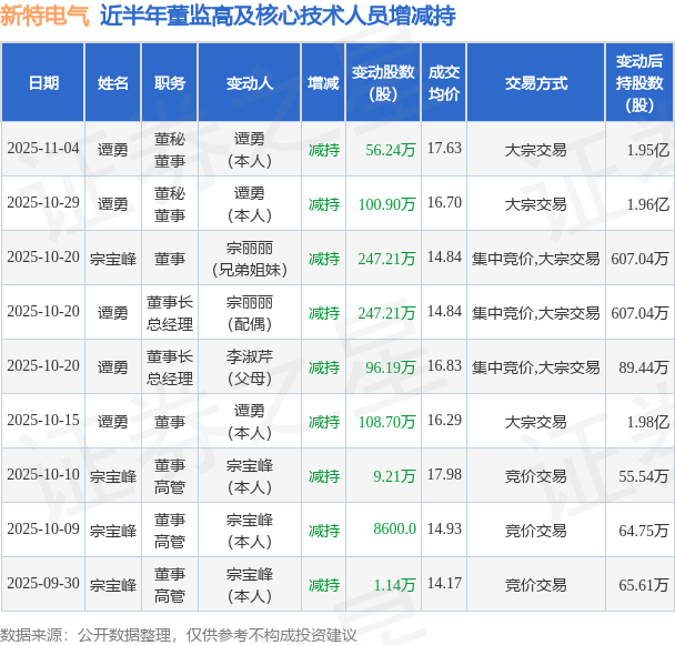 新特电气近半年内的董监高及核心技术人员增减持详情如下: