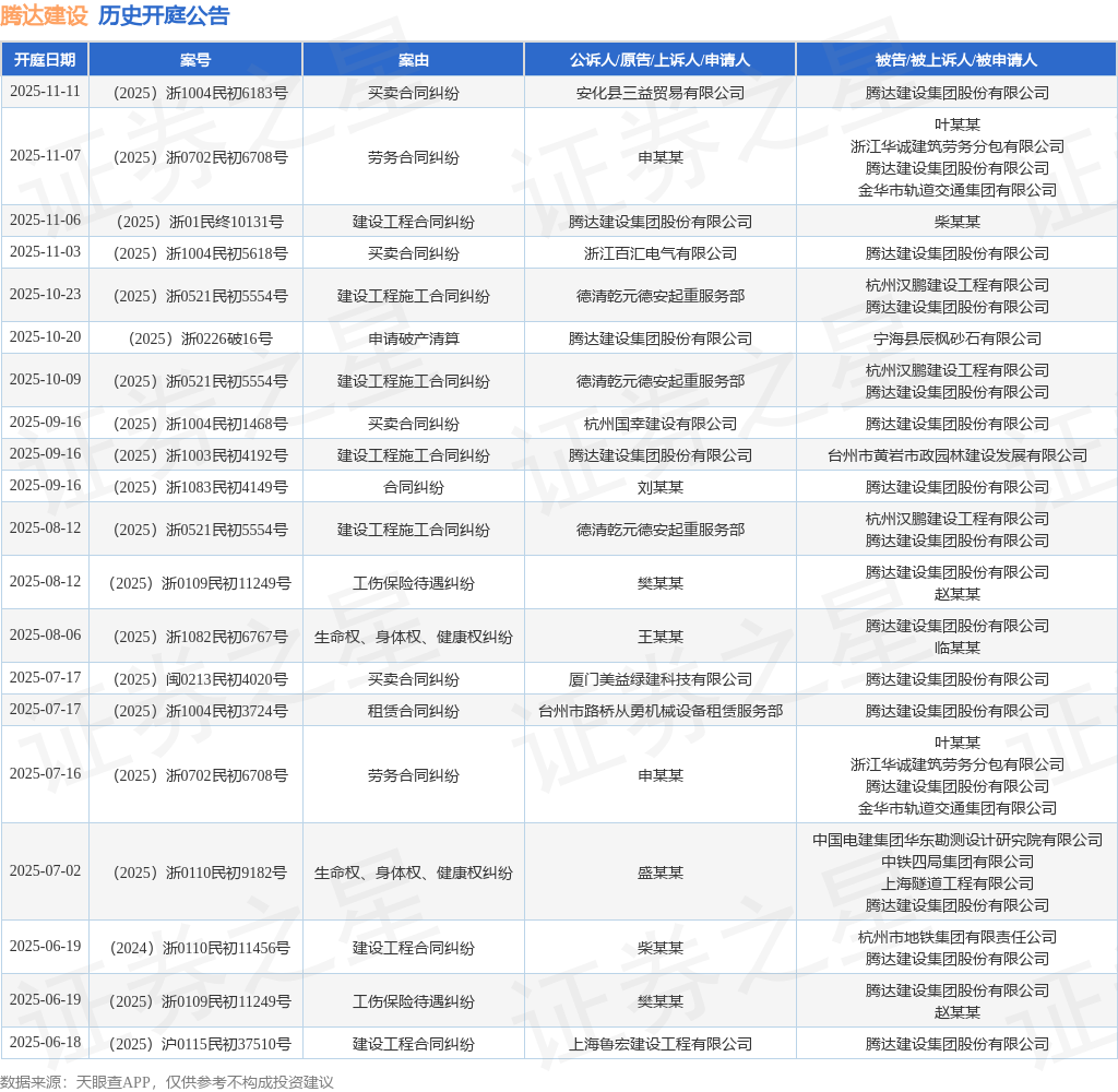 案号:(2025)浙0702民初6708号根据统计,近一年内以腾达建设集团股份有限公司为当事人的历史开庭公告有47则,其中案由为“买卖合同纠纷”的公告以10则居首,其次为“建设工程合同纠纷”有9则,“承揽合同纠纷”有8则。历史开庭公告(前20条)如下: