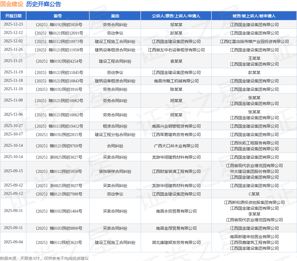 案号:(2025)赣0121民初10062号根据统计,近一年内以江西国金建设集团有限公司为当事人的历史开庭公告有52则,其中案由为“建设工程施工合同纠纷”的公告以12则居首,其次为“买卖合同纠纷”有10则,“劳务合同纠纷”有8则。历史开庭公告(前20条)如下: