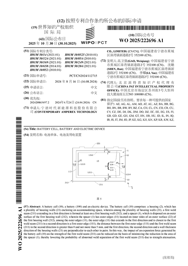 证券之星消息,根据企查查数据显示宁德时代(300750)公布了一项国际专利申请,专利名为“电池单体、电池及用电装置”,专利申请号为PCT/CN2024/112715,国际公布日为2025年10月30日。