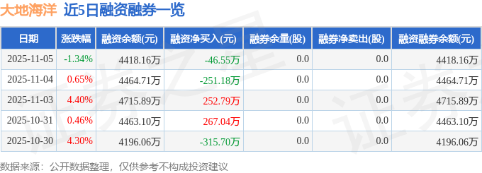大地海洋融资融券信息显示,融资方面,当日融资买入95.03万元,融资偿还141.58万元,融资净偿还46.55万元。融券方面,融券卖出0.0股,融券偿还0.0股,融券余量0.0股,融券余额0.0万元。融资融券余额4418.16万元。