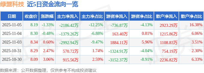 证券之星消息,截至2025年11月5日收盘,绿盟科技(300369)报收于8.19元,下跌1.33%,换手率2.69%,成交量21.75万手,成交额1.78亿元。