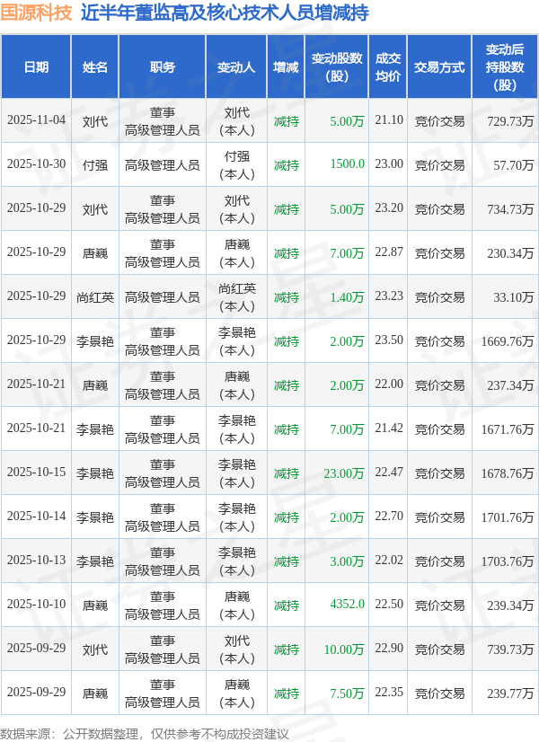 国源科技近半年内的董监高及核心技术人员增减持详情如下: