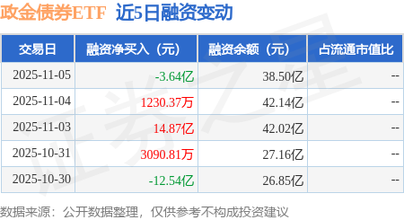 证券之星消息,11月5日,政金债券ETF(511520)融资买入1.17亿元,融资偿还4.81亿元,融资净卖出3.64亿元,融资余额38.5亿元,近20个交易日中有12个交易日出现融资净买入。