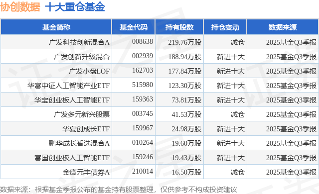 根据2025基金Q3季报公募基金重仓股数据,重仓该股的公募基金共50家,其中持有数量最多的公募基金为广发基金的广发科技创新混合A。广发科技创新混合A目前规模为31.41亿元,最新净值2.3373(11月5日),较上一交易日上涨0.07%,近一年上涨37.44%。该公募基金现任基金经理为吴远怡。吴远怡在任的基金产品包括:广发创新升级混合,管理时间为2020年9月30日至今,期间收益率为-17.66%;广发北交所精选两年定开混合A,管理时间为2021年11月23日至今,期间收益率为83.25%;广发价值核心混合A,管理时间为2022年11月1日至今,期间收益率为84.46%。