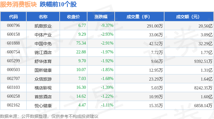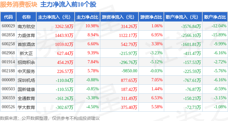 从资金流向上来看,当日服务消费板块主力资金净流出8.31亿元,游资资金净流入2.88亿元,散户资金净流入5.43亿元。服务消费板块个股资金流向见下表: