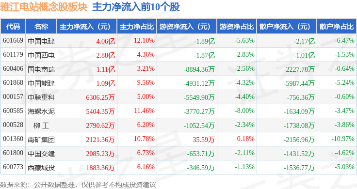 从资金流向上来看,当日雅江电站概念股板块主力资金净流出20.63亿元,游资资金净流入688.79万元,散户资金净流入20.56亿元。雅江电站概念股板块个股资金流向见下表: