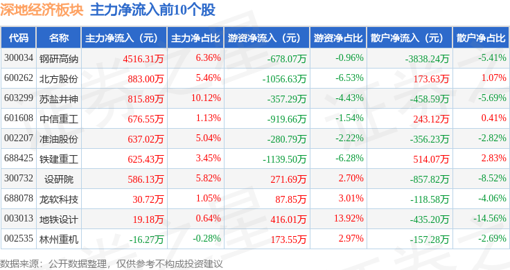 从资金流向上来看,当日深地经济板块主力资金净流出2.92亿元,游资资金净流出1.05亿元,散户资金净流入3.97亿元。深地经济板块个股资金流向见下表: