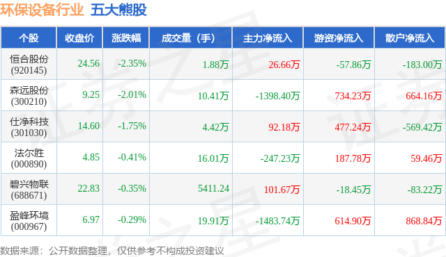 个股表现方面,环保设备行业当日领跌股为恒合股份(920145),该股当日报收24.56,下跌2.35%,成交量1.88万,主力资金净流入26.66万元。森远股份(300210)以下跌2.01%紧随其后,该股当日成交量10.41万,主力资金净流出1398.4万元。除此之外,仕净科技(301030)、法尔胜(000890)、碧兴物联(688671)均进入当日熊股之列。具体个股列表见下表: