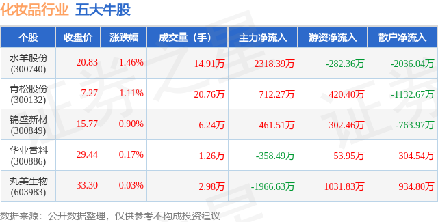 个股表现方面,化妆品行业当日领涨股为水羊股份(300740),该股当日报收20.83,上涨1.46%,成交量14.91万,主力资金净流入2318.39万元。青松股份(300132)以上涨1.11%紧随其后,该股当日成交量20.76万,主力资金净流入712.27万元。除此之外,锦盛新材(300849)、华业香料(300886)、丸美生物(603983)均进入当日牛股之列。具体个股列表见下表: