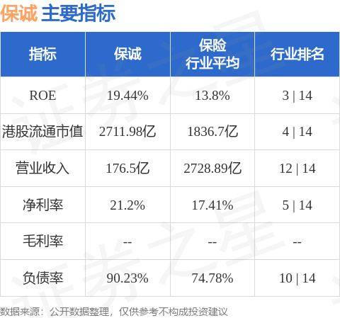 保诚港股市值2711.98亿港元,在保险行业中排名第4。主要指标见下表: