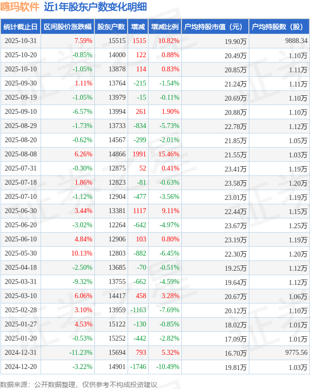 从股价来看,2025年10月20日至2025年10月31日,鸥玛软件区间涨幅为7.59%,在此期间股东户数增加1515.0户,增幅为10.82%。