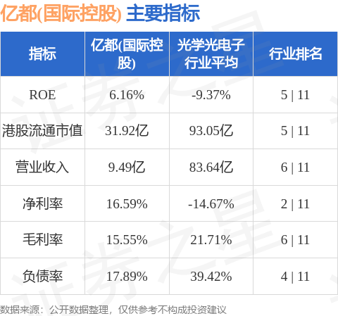 亿都(国际控股)港股市值31.92亿港元,在光学光电子行业中排名第5。主要指标见下表: