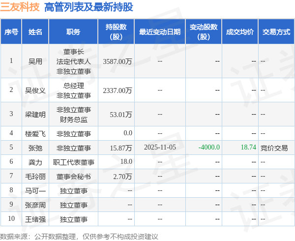 三友科技近半年内的董监高及核心技术人员增减持详情如下: